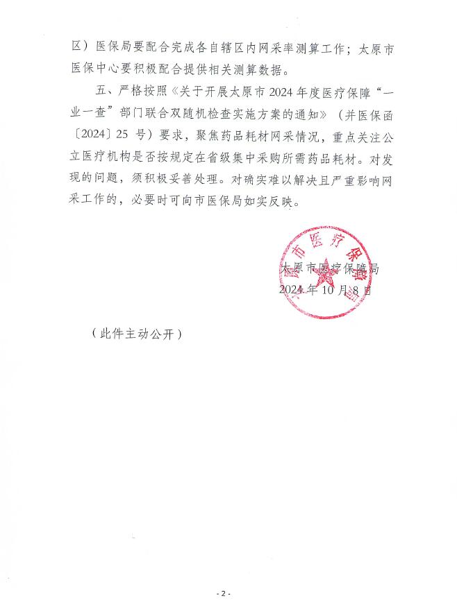 各县(市、区)医疗保障局,市医疗保险管理服务中心,市药械集中招标采购服务中心: 为有效提升公立医疗机构药品耗材网采率,持续巩固和增强集中带量采购改革成效,现就做好全市药品耗材网采工作有关事项提醒如下: 一、进一步落实好公立医疗机构省级平台网上阳光采购属地监管责任,加强政策宣传和业务指导,压实公立医疗机构网采主体责任。 二、全市公立医疗机构所需全部药品和医用耗材(含集采、非集采产品等)须通过山西省药品和医用耗材招标采购交易平台进行网上阳光采购,不得线下采购。 三、对于已经完成采购流程但是尚未将数据录入省采购平台的医疗机构,督促其尽快完成平台数据录入,确保平台采购数据准确、完整。 四、太原市药招中心要因地制宜部署开展市、县两级网采率测算工作,逐步推动网采率下算至医疗机构,具备条件的可直接采用医疗机构相关原始数据测算网采率;各县(市、区)医保局要配合完成各自辖区内网采率测算工作;太原市医保中心要积极配合提供相关测算数据。 五、严格按照《关于开展太原市2024年度医疗保障“一业一查”部门联合双随机检查实施方案的通知》(并医保函〔2024〕25号〕要求,聚焦药品耗材网采情况,重点关注公立医疗机构是否按规定在省级集中采购所需药品耗材。对发现的问题,须积极妥善处理。对确实难以解决且严重影响网采工作的,必要时可向市医保局如实反映。