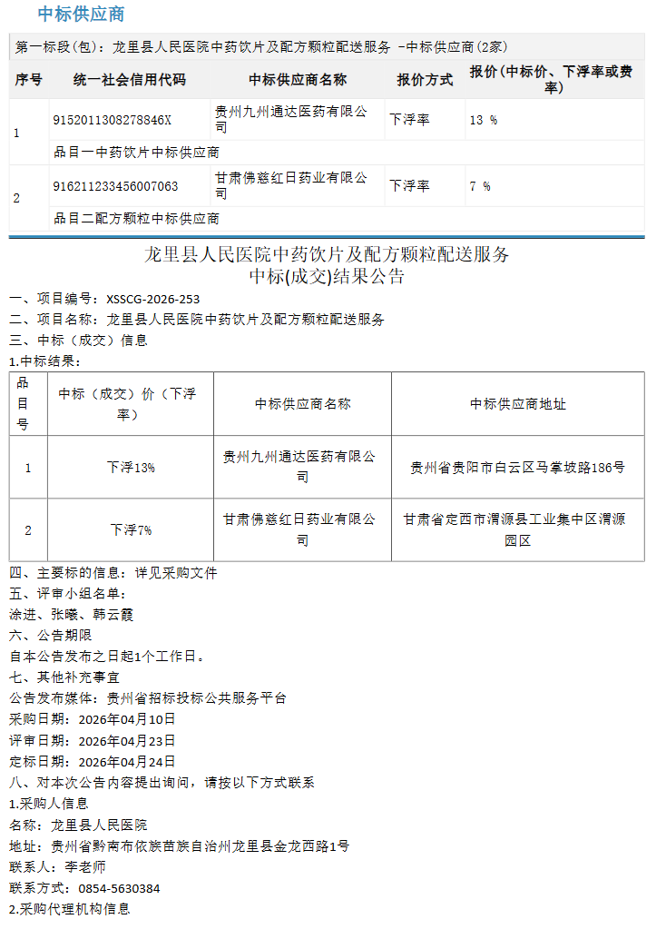 【黔南布依族苗族自治州龙里县人民医院】贵州省黔南布依族苗族自治州龙里县人民医院中药饮片及配方颗粒配送服务中标(成交)结果公告