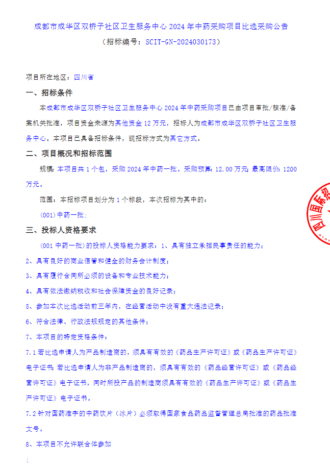 【成都市成华区双桥子社区卫生服务中心】四川省成都市成华区双桥子社区卫生服务中心2024年中药采购项目比选采购公告