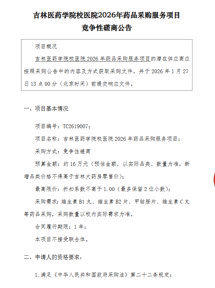 【吉林医药学院】吉林医药学院校医院2026年药品采购服务项目-招标公告