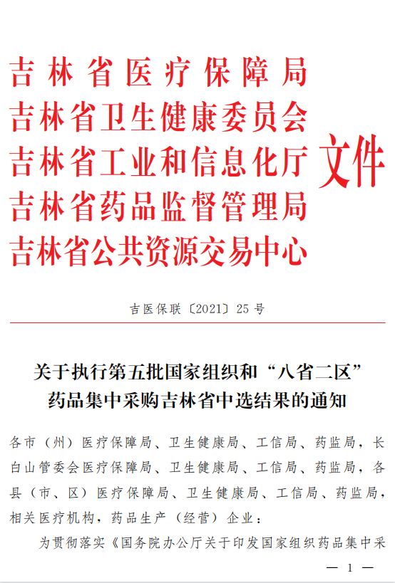 【吉林】2021年吉林省关于执行第五批国家组织和“八省二区”药品集中采购吉林省中选结果的通知 吉医保联[2021]25号