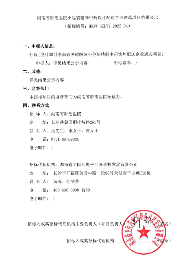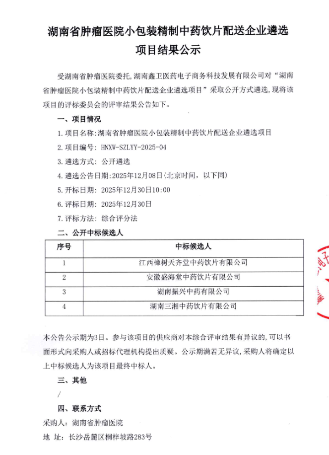 【湖南省肿瘤医院】湖南省肿瘤医院小包装精制中药饮片配送企业遴选项目结果公示