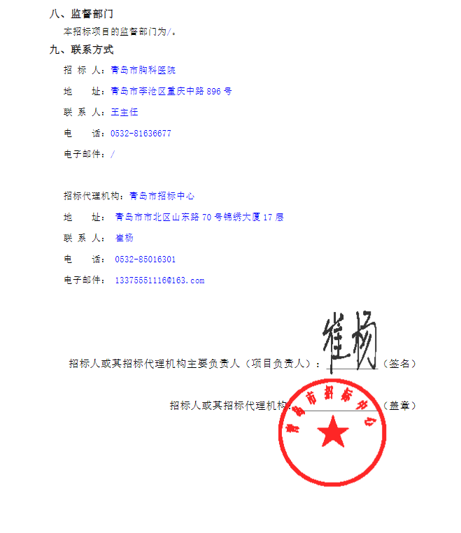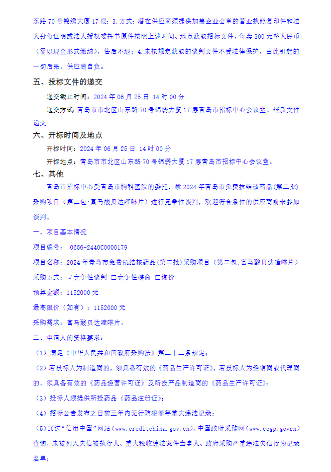 【青岛市胸科医院】山东省2024年青岛市免费抗结核药品(第二批)采购项目(第二包:富马酸贝达喹啉片)竞争性谈判公告