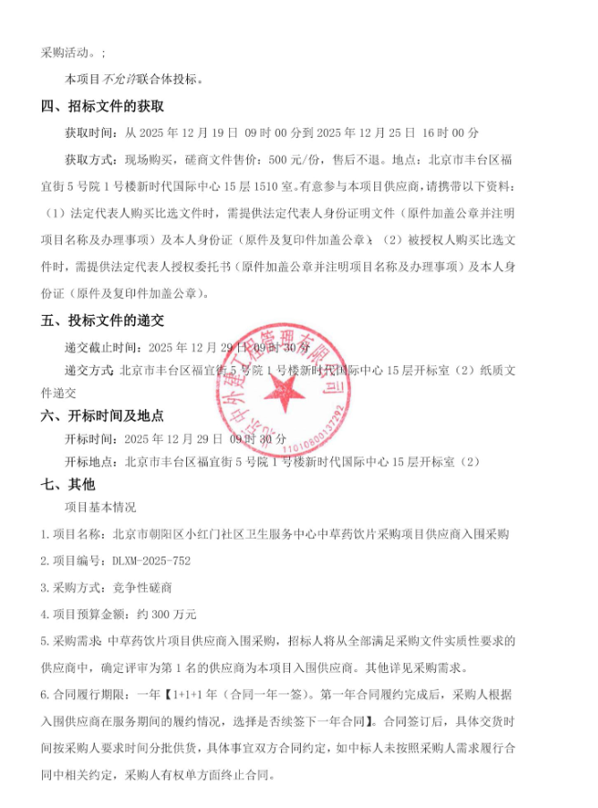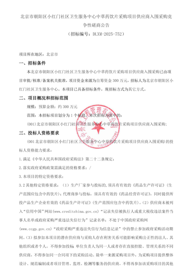 【北京市朝阳区小红门社区卫生服务中心】北京市朝阳区小红门社区卫生服务中心中草药饮片采购项目供应商入围采购竞争性磋商公告