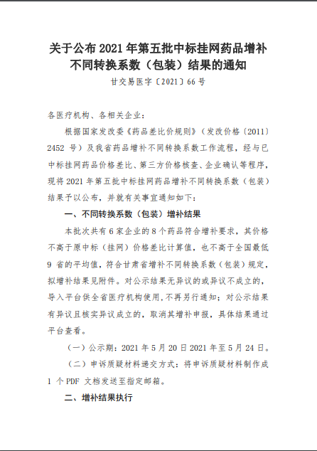 【甘肃】甘肃省关于公布2021年第五批中标挂网药品增补不同转换系数(包装)结果的通知