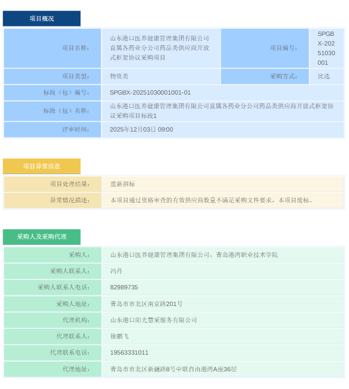 【山东港口医养健康管理集团】山东港口医养健康管理集团有限公司直属各药业分公司药品类供应商开放式框架协议采购项目标段1废标