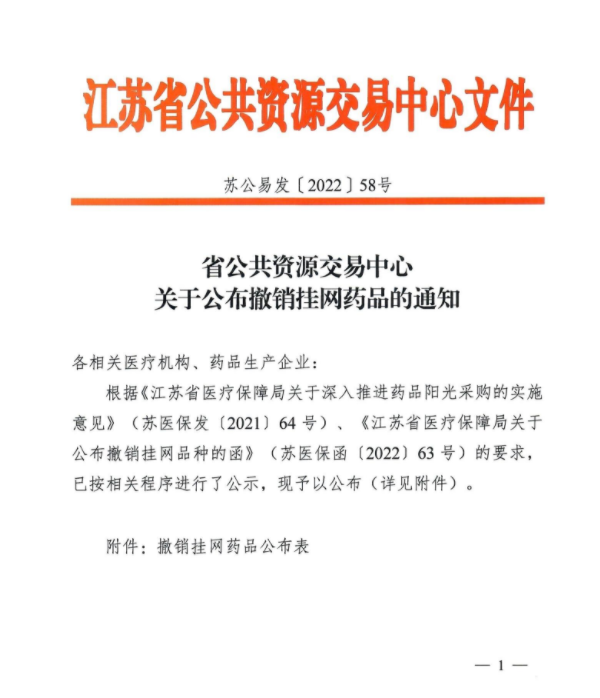 【江苏】江苏省公共资源交易中心关于公布撤销挂网药品的通知(20220322)