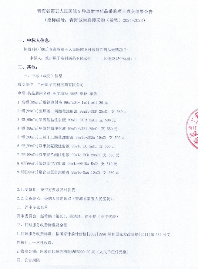【青海省第五人民医院】青海省第五人民医院9种放射性药品采购项目成交结果公告
