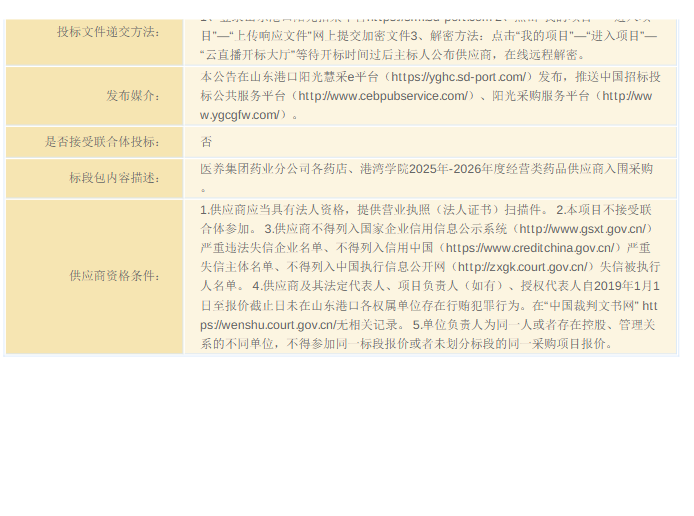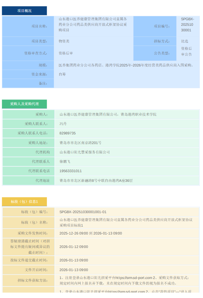 【山东港口医养健康管理集团】山东港口医养健康管理集团有限公司直属各药业分公司药品类供应商开放式框架协议采购项目