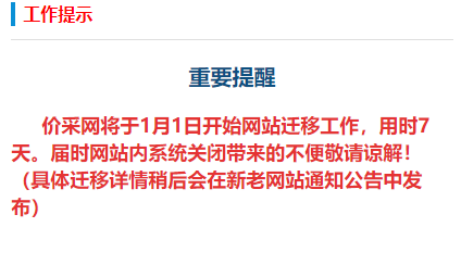 价采网将于1月1日开始网站迁移工作,用时7天。届时网站内系统关闭带来的不便敬请谅解!(具体迁移详情稍后会在新老网站通知公告中发布)
