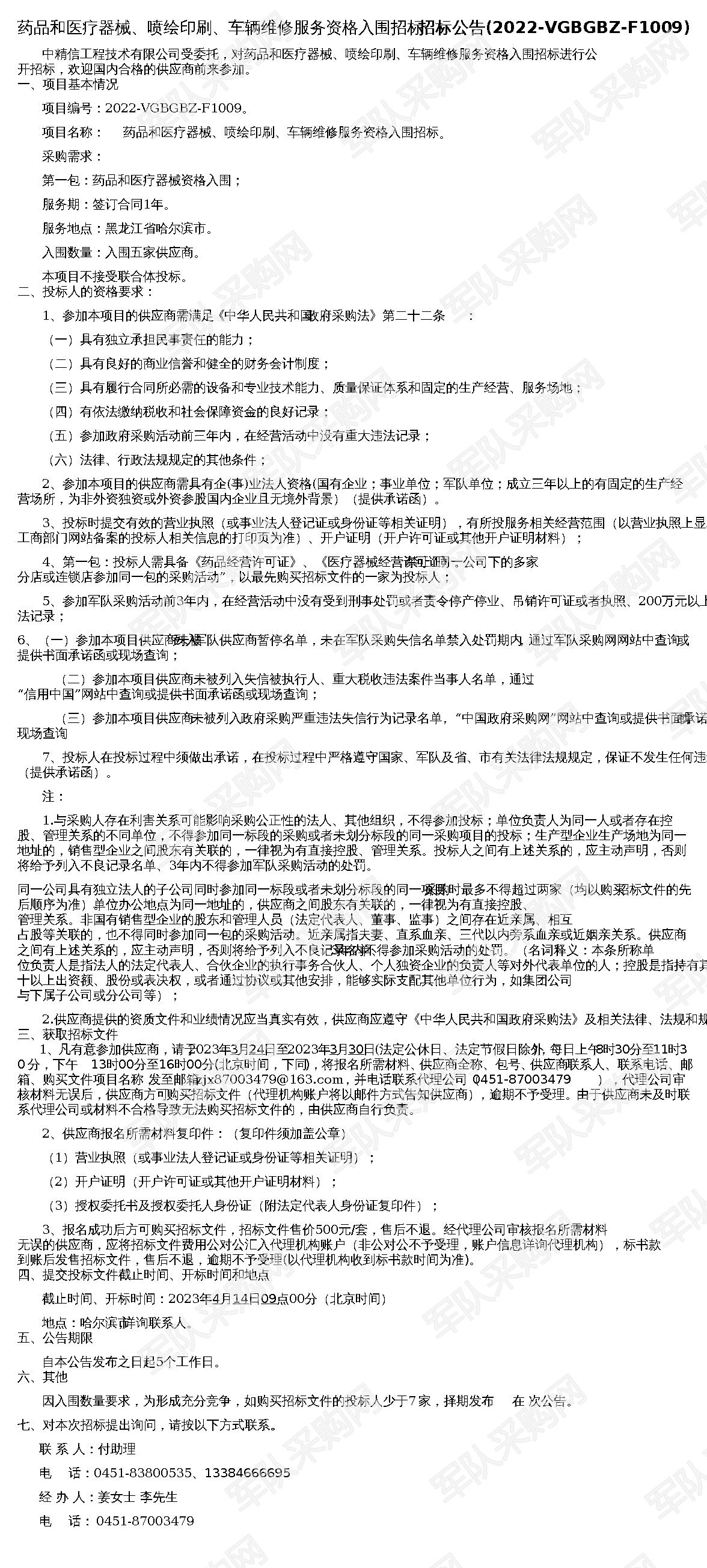 【军队采购】军队采购网药品和医疗器械、喷绘印刷、车辆维修服务资格入围招标招标公告(2022-VGBGBZ-F1009)