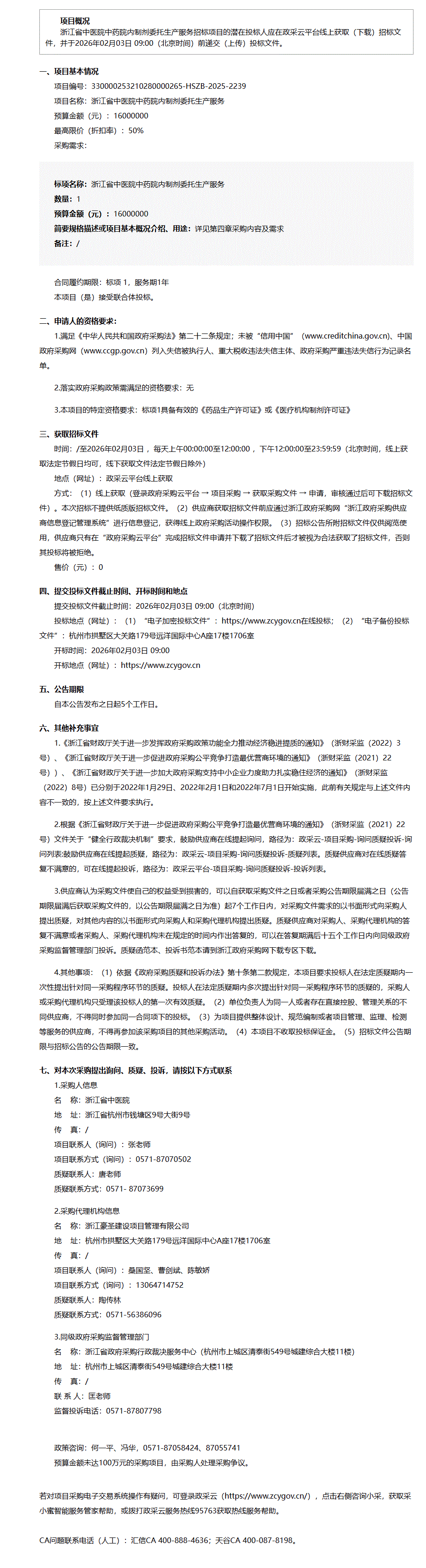 【浙江省中医院】浙江豪圣建设项目管理有限公司关于浙江省中医院中药院内制剂委托生产服务公开招标公告
