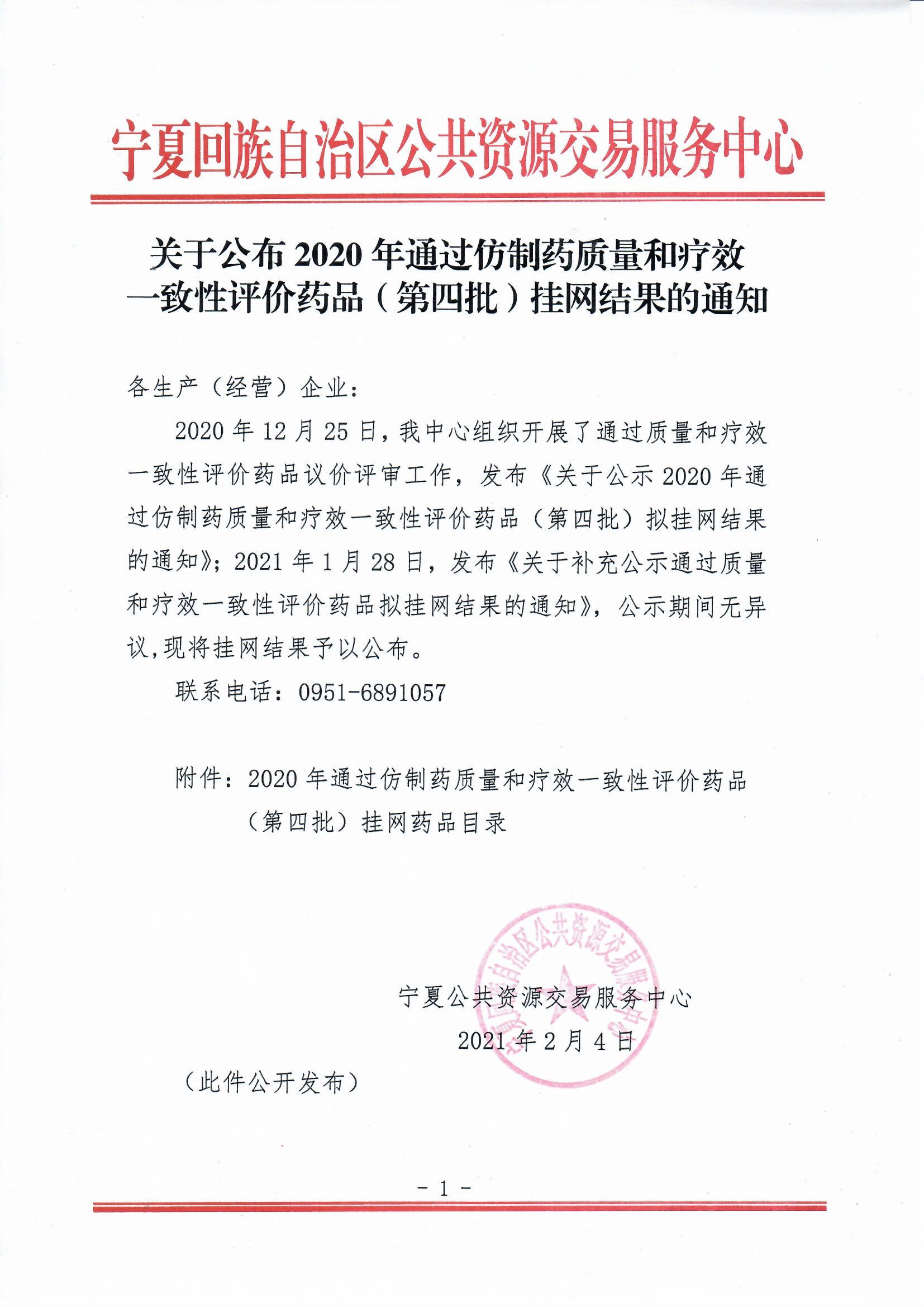 【宁夏】2021年宁夏自治区关于公布2020年通过仿制药质量和疗效 一致性评价药品(第四批)挂网结果的通知