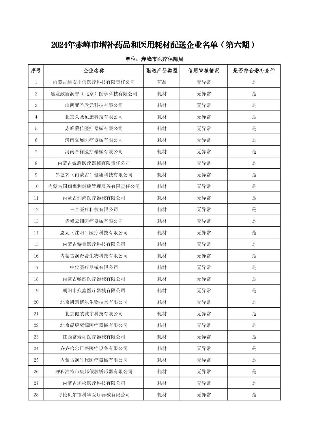 【赤峰】2024年赤峰市增补药品和医用耗材配送企业名单(第六期)