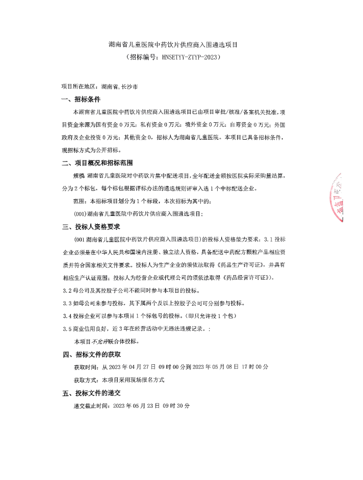 【湖南省儿童医院】湖南省儿童医院中药饮片供应商入围遴选项目