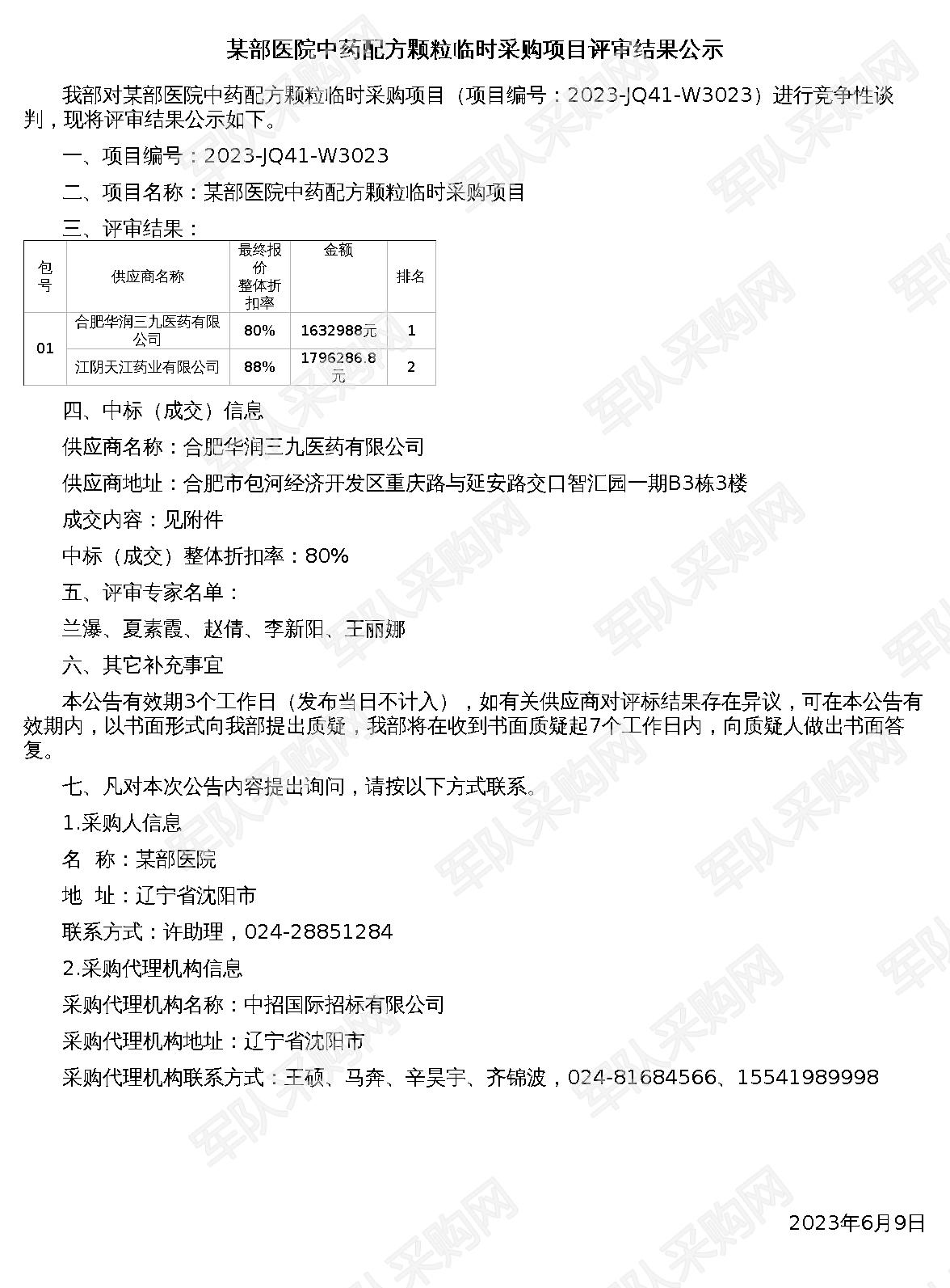 【军队采购】军队采购网某部医院中药配方颗粒临时采购项目评审结果公示(2023-JQ41-W3023)