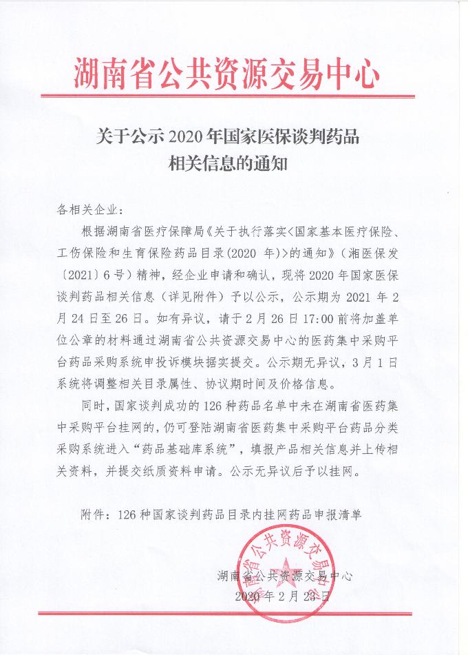 【湖南】2021年湖南省关于公示2020年国家医保谈判药品相关信息的通知