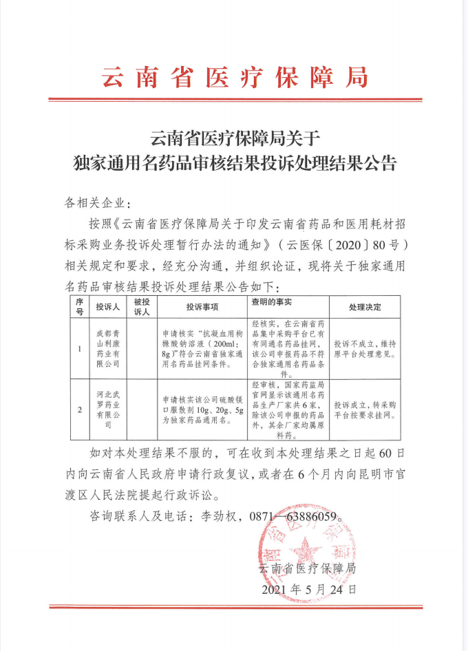 【云南】2021年云南省医疗保障局关于独家通用名药品审核结果投诉处理结果公告