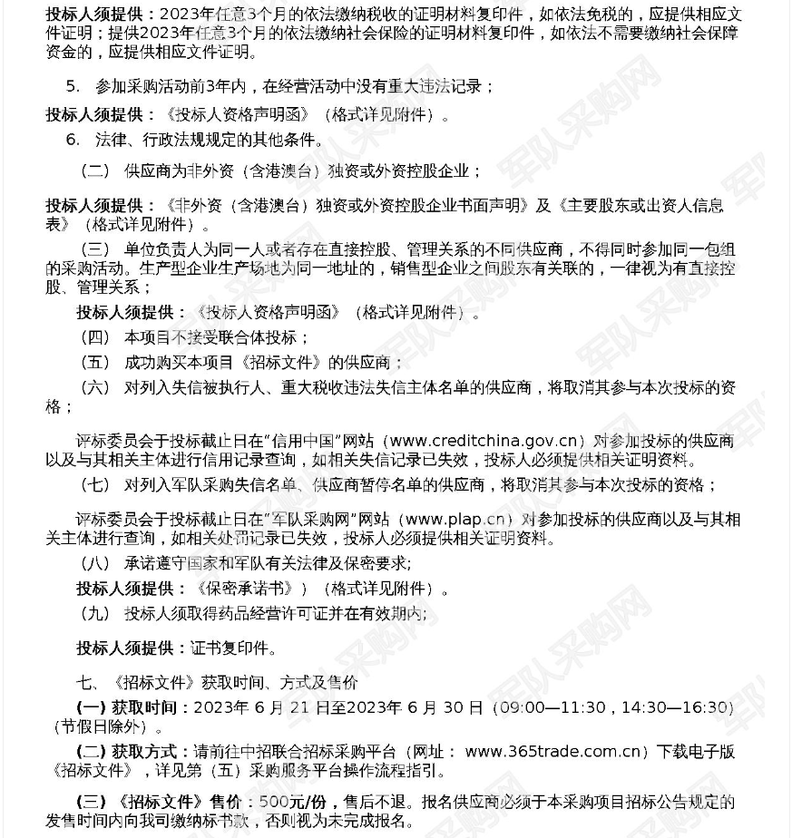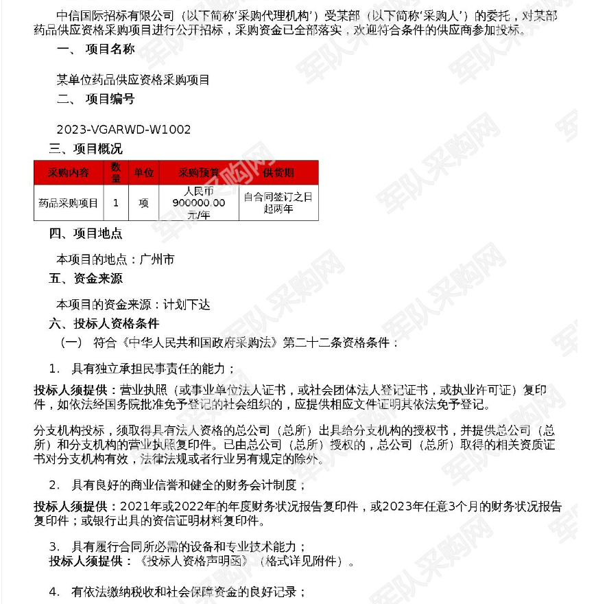 【军队采购】军队采购网某单位药品供应资格采购项目招标公告2023-VGARWD-W1002