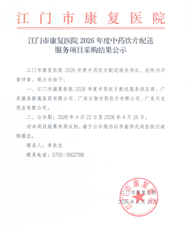 【江门市康复医院】广东省江门市康复医院2026年度中药饮片配送服务项目采购结果公示