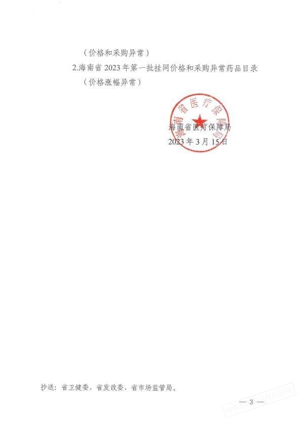 按照《国家医疗保障局办公室关于做好2023年医药集中采购和价格管理工作的通知》(医保办函〔2023〕13号)和《海南省医疗保障局关于印发海南省药品挂网采购实施方案的通知》(琼医保〔2022〕285号)要求,为持续加大对全省挂网药品价格和采购异常行为的监测,用好医药招采价格引导机制,强化事中事后监管,现对外公开发布2023年第一批挂网价格和采购异常药品目录(以下简称“异常药品目录”,见附件),有关事项通知如下:
