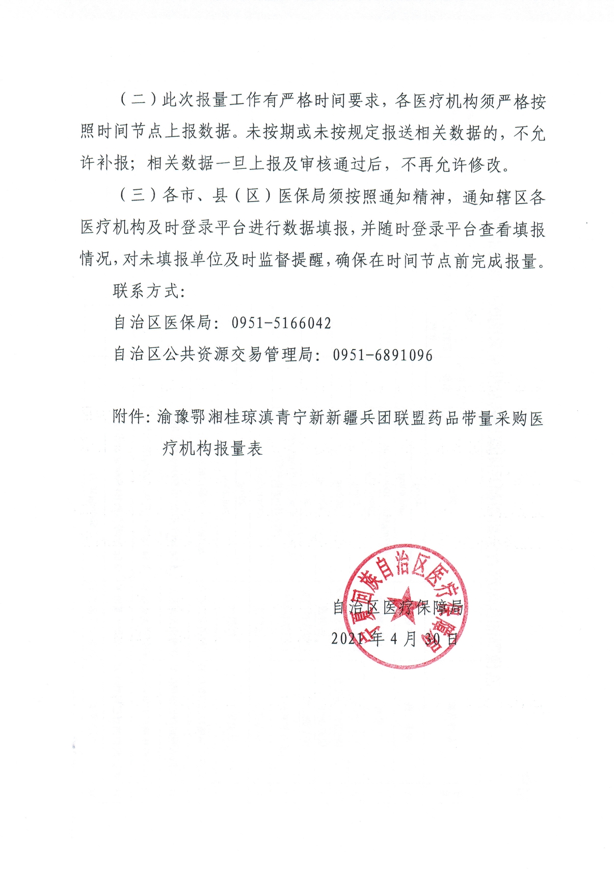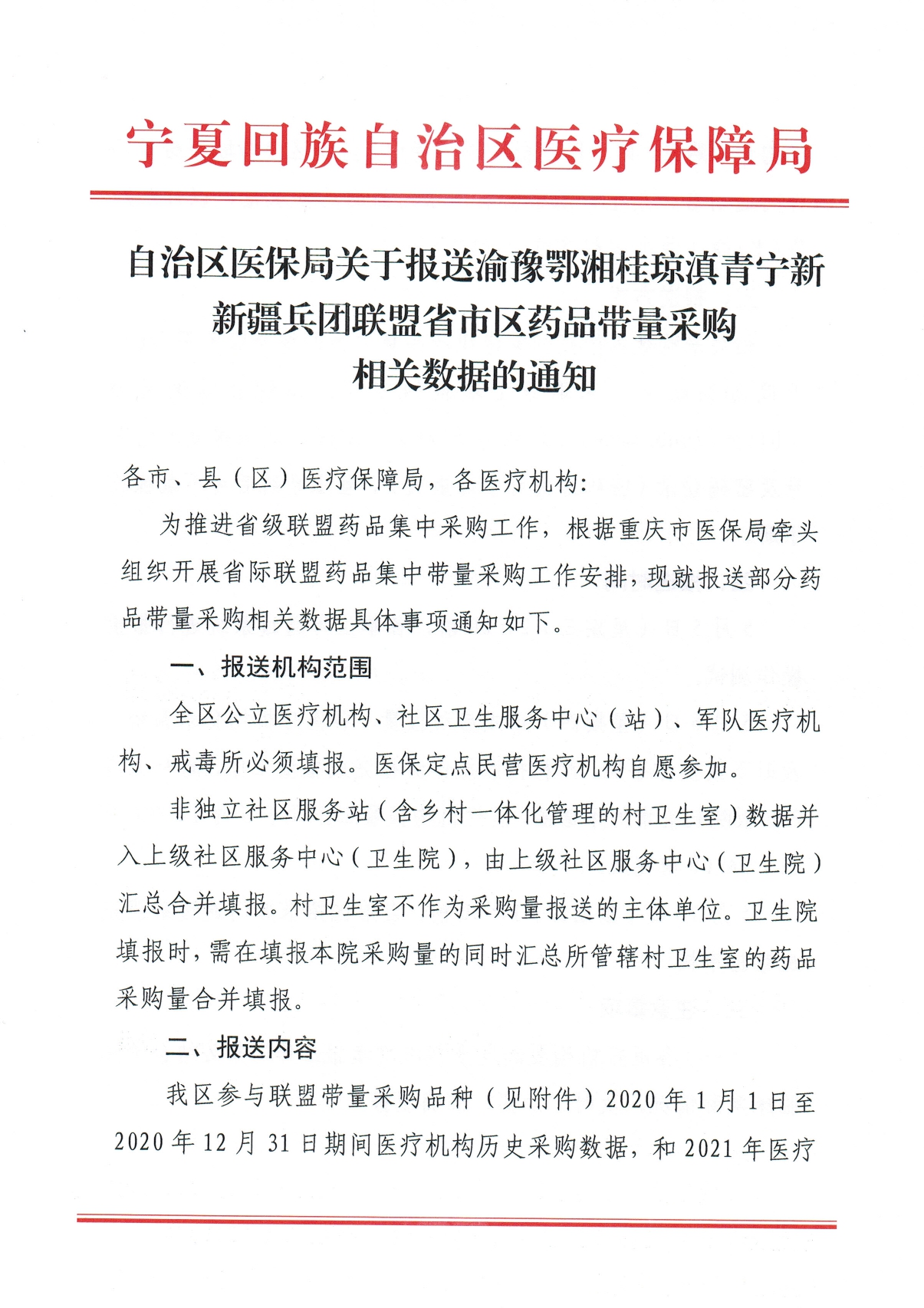 【宁夏】2021年宁夏自治区自治区医保局关于报送渝豫鄂湘桂琼滇青宁新新疆兵团联盟省市区药品带量采购相关数据的通知