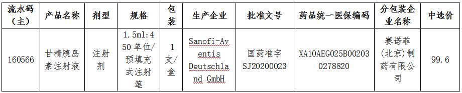 近日,根据国家药品联采办有关文件,经赛诺菲(北京)制药有限公司申请,现将该企业甘精胰岛素450单位进口分包装药品纳入第六批国家组织药品集中采购(胰岛素专项)安徽中选药品网上采购目录,详见下表: