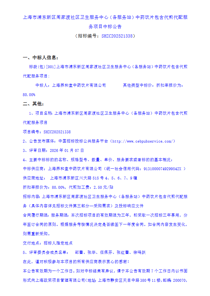【上海市浦东新区周家渡社区卫生服务中心】上海市浦东新区周家渡社区卫生服务中心(各服务站)中药饮片包含代煎代配服务项目中标公告
