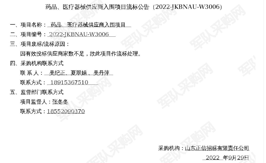 【军队采购】药品、医疗器械供应商入围项目流标公告(2022-JKBNAU-W3006)