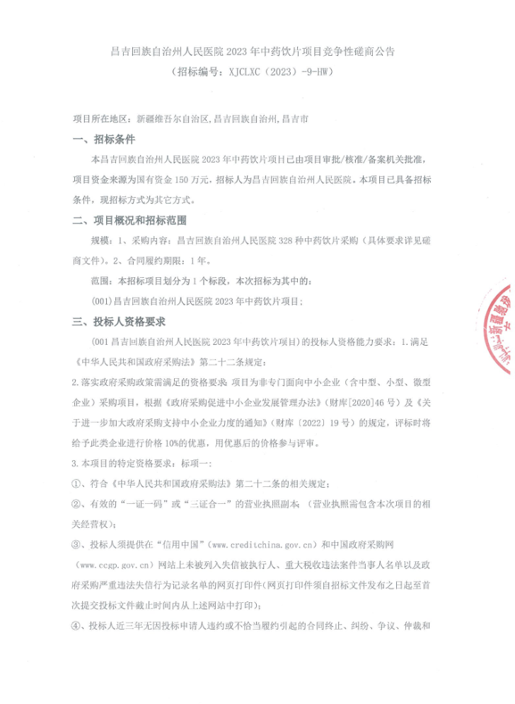 【昌吉回族自治州人民医院】新疆维吾尔自治区昌吉回族自治州人民医院2023年中药饮片项目竞争性磋商公告