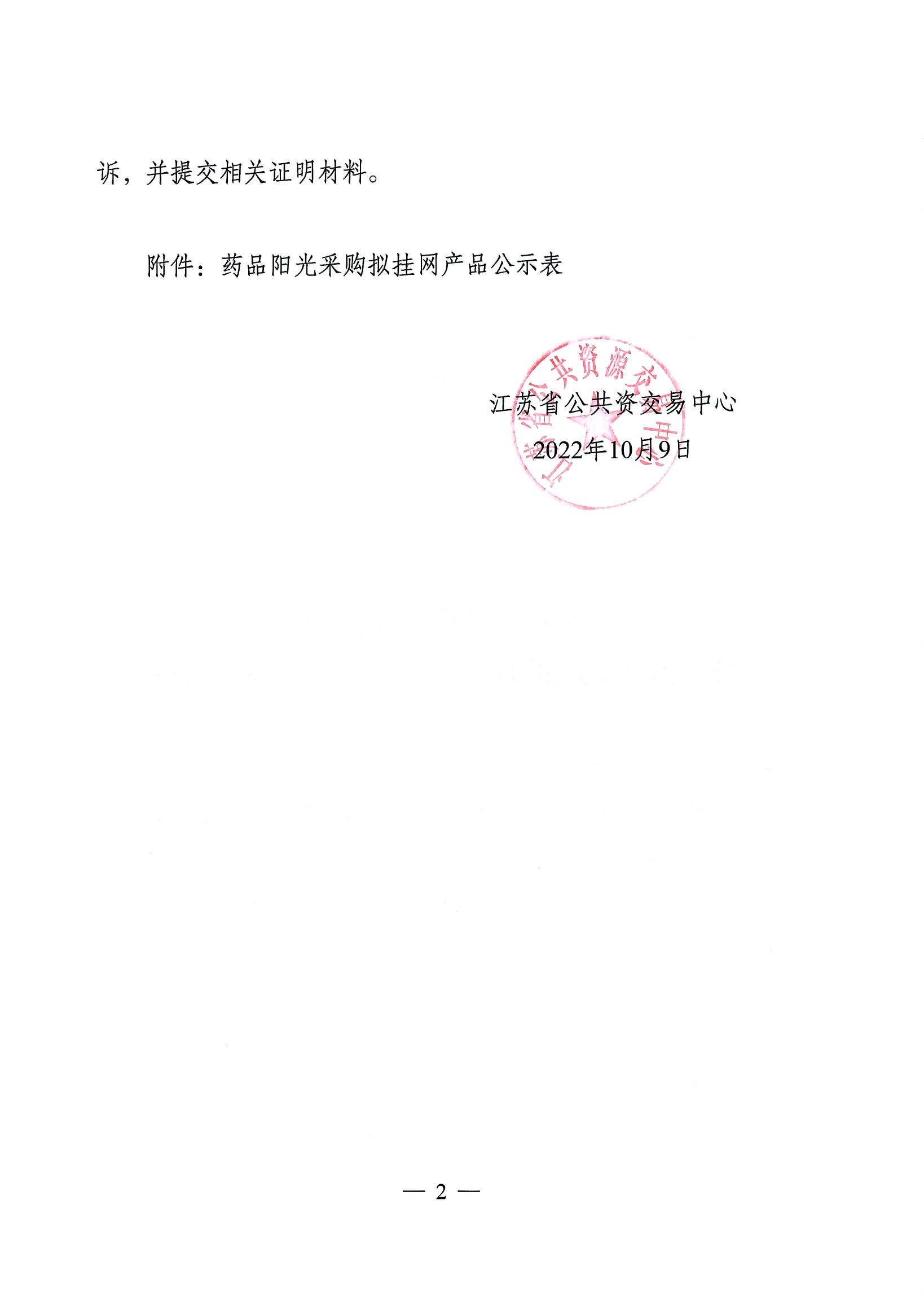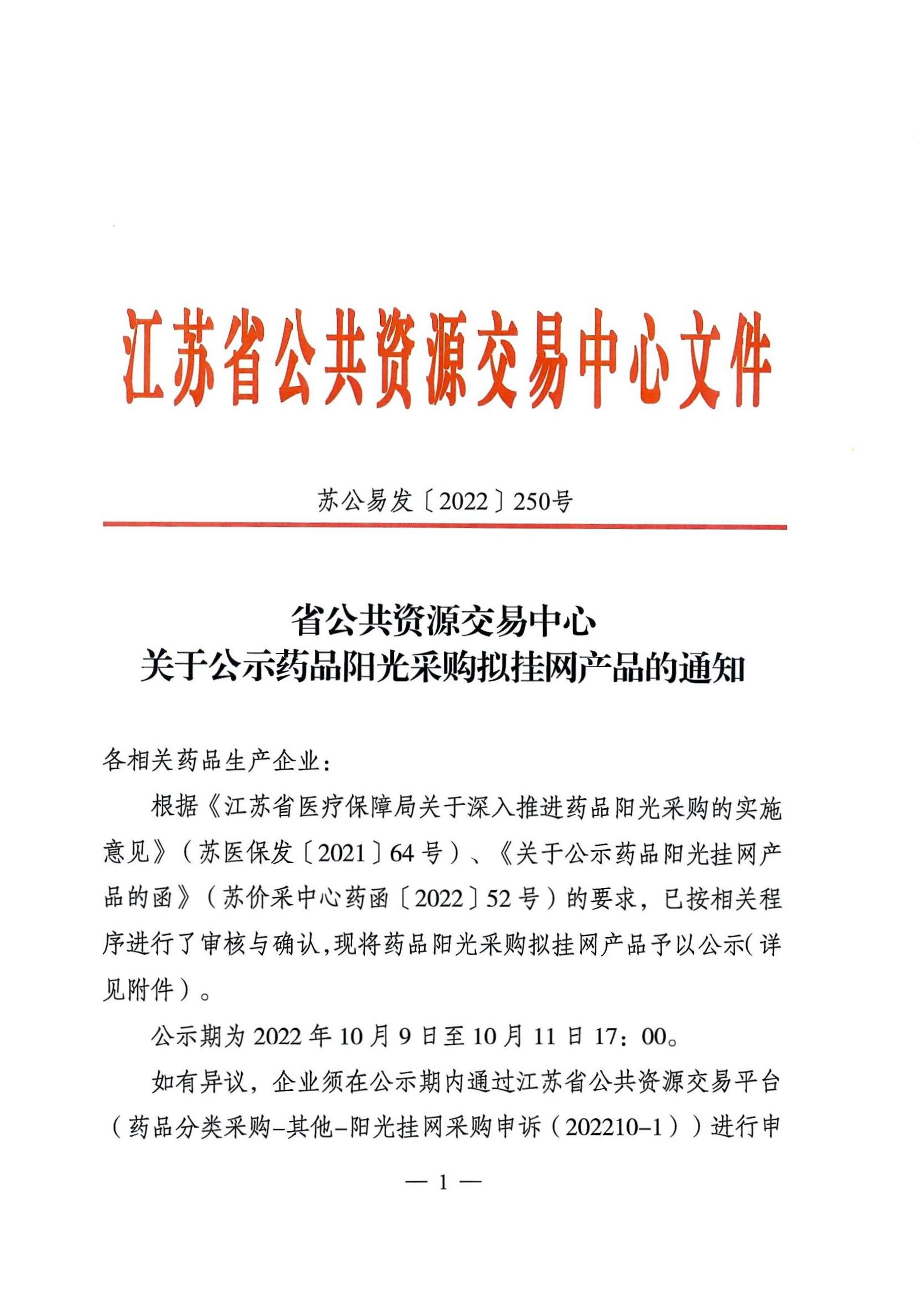 【江苏】省公共资源交易中心关于公示药品阳光采购拟挂网产品的通知