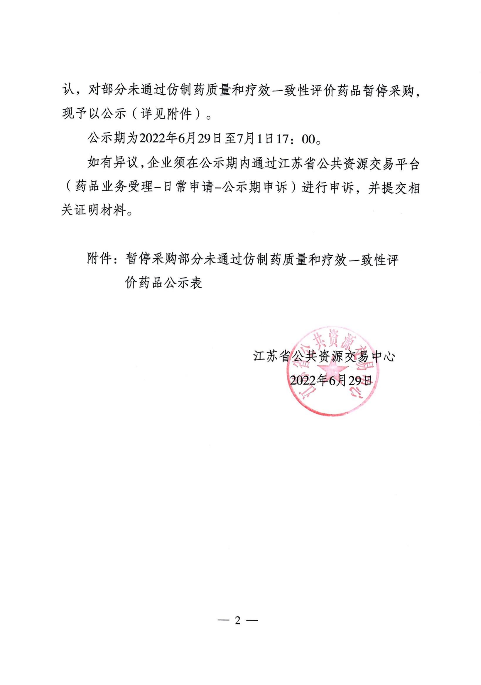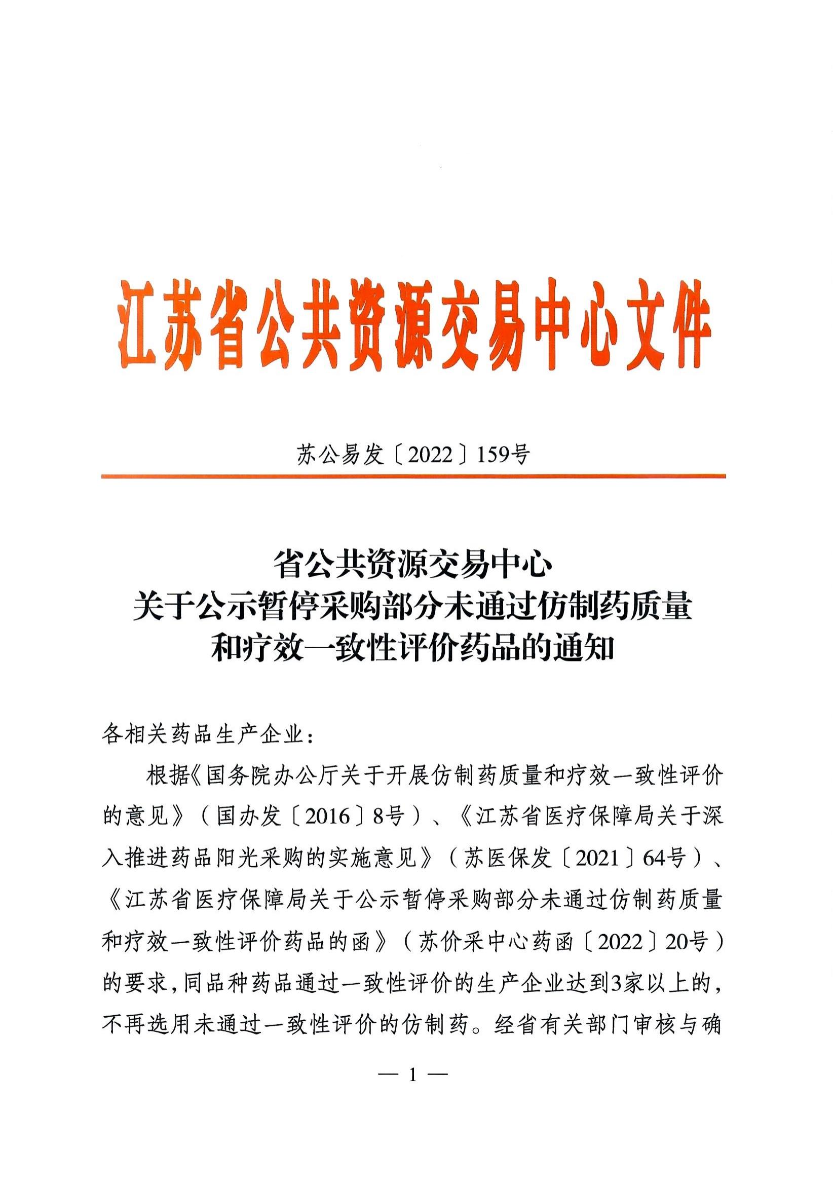 【江苏】省公共资源交易中心关于公示暂停采购部分未通过仿制药质量和疗效一致性评价药品的通知