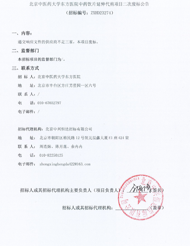 【北京中医药大学东方医院】北京中医药大学东方医院中药饮片延伸代煎项目二次废标公告