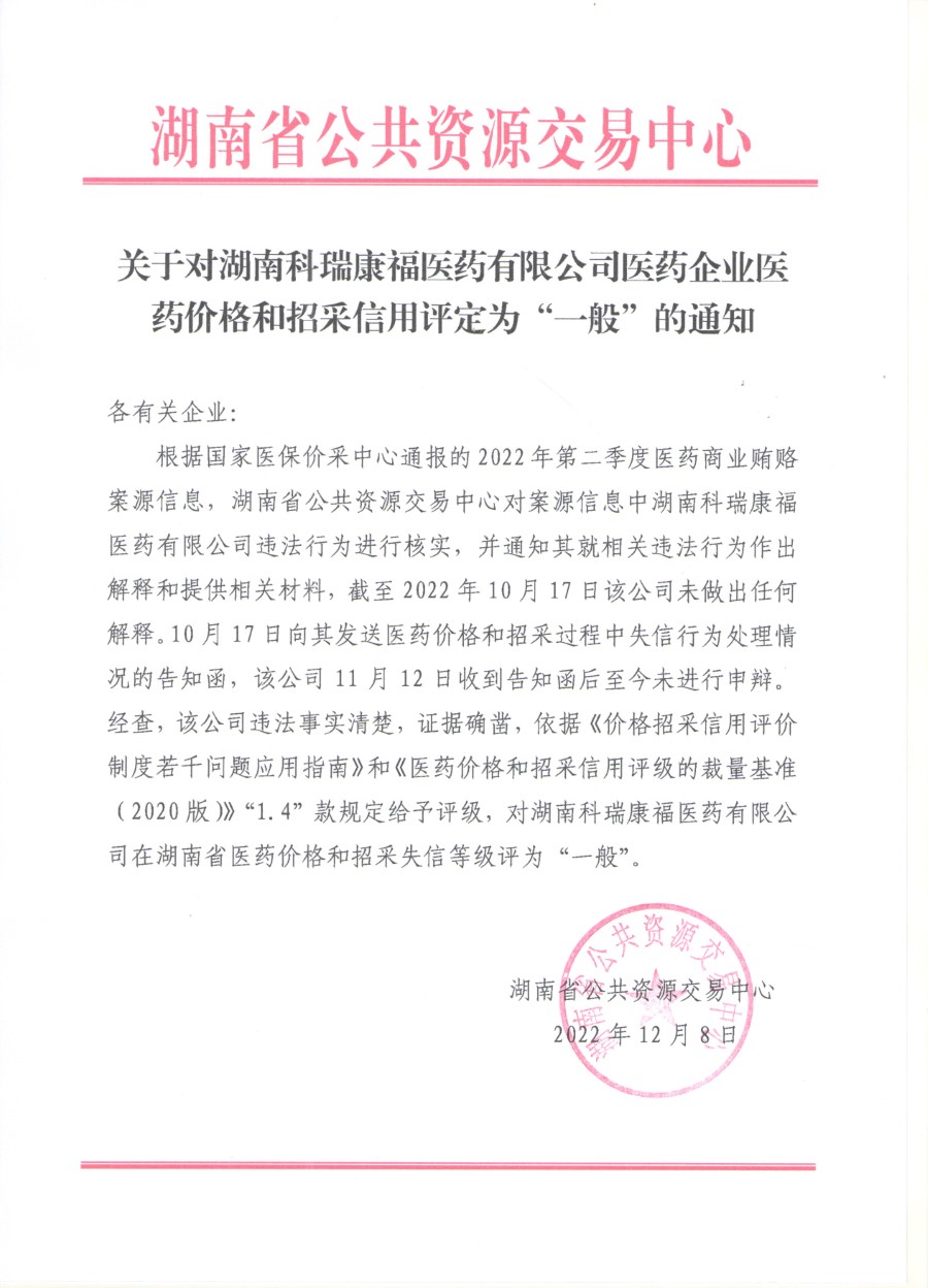 【湖南】关于对湖南科瑞康福医药有限公司医药企业医药价格和招采信用评定为“一般”的通知