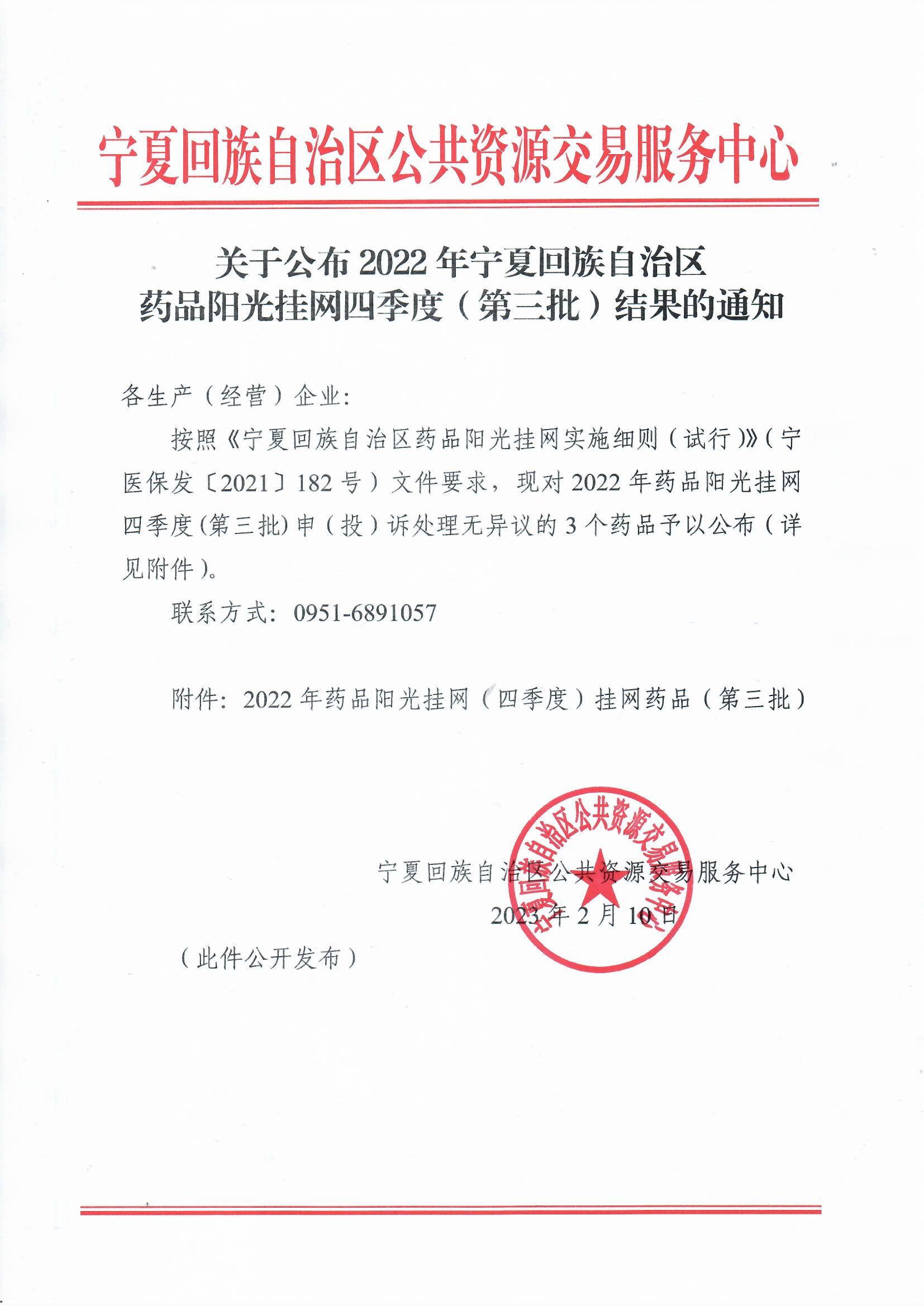 【宁夏】关于公布2022年宁夏回族自治区药品阳光挂网四季度(第三批)结果的通知