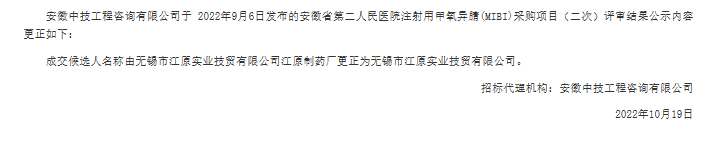 【安徽省第二人民医院】注射用甲氧异腈(MIBI)采购项目(二次)评审结果公示内容更正