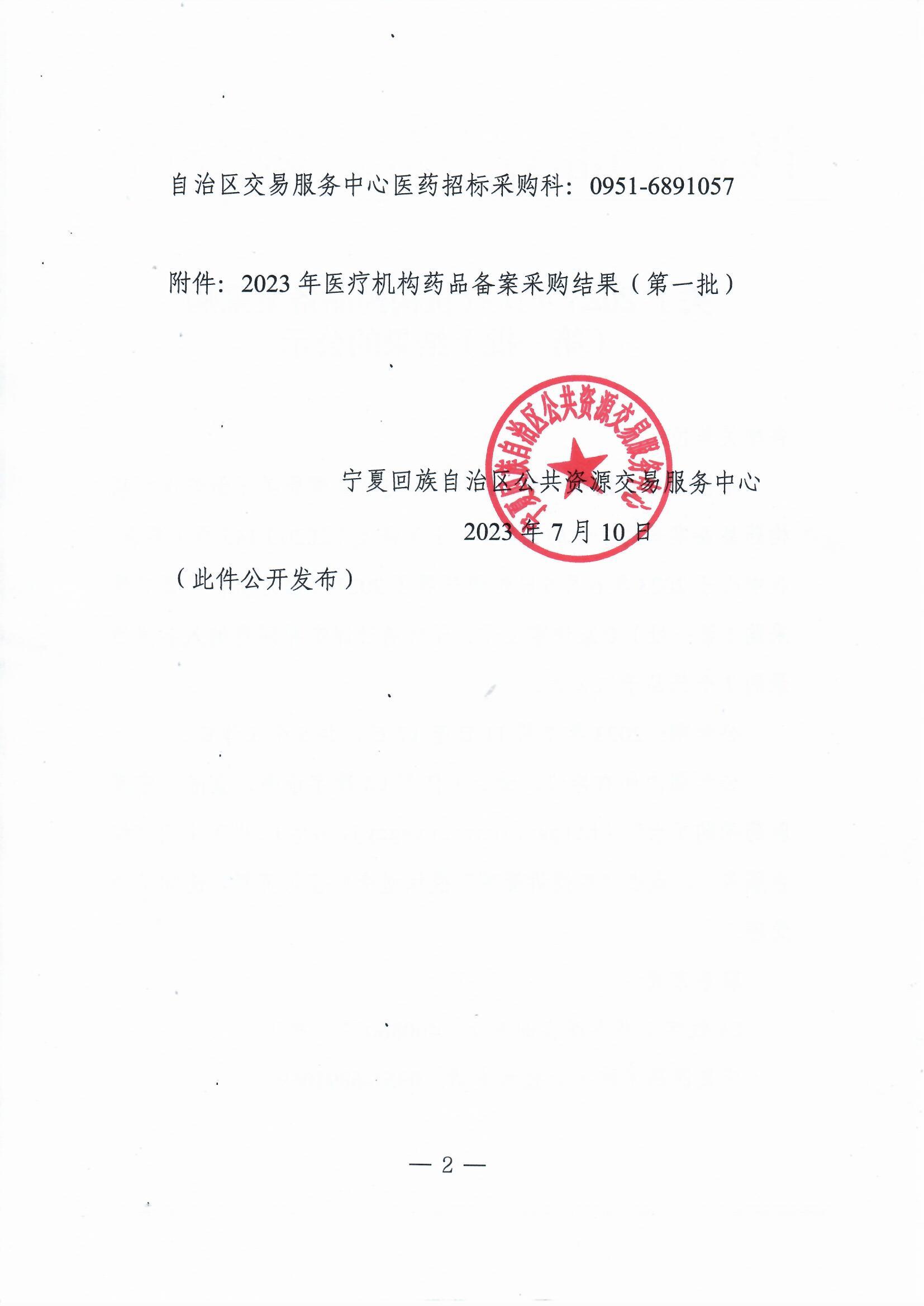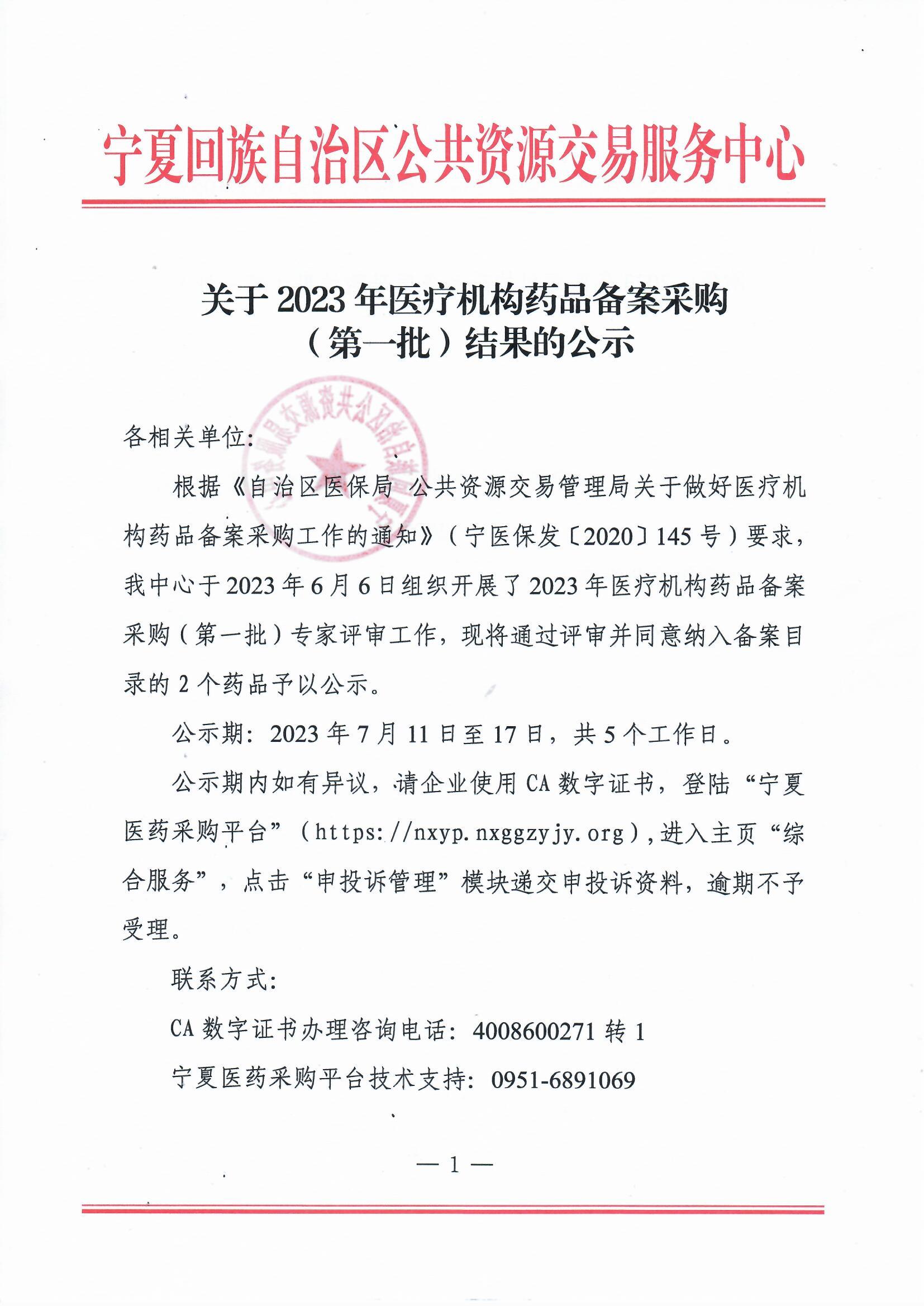 根据《自治区医保局公共资源交易管理局关于做好医疗机构药品备案采购工作的通知》(宁医保发〔2020〕145号)要求,我中心于2023年6月6日组织开展了2023年医疗机构药品备案采购(第一批)专家评审工作,现将通过评审并同意纳入备案目录的2个药品予以公示。
