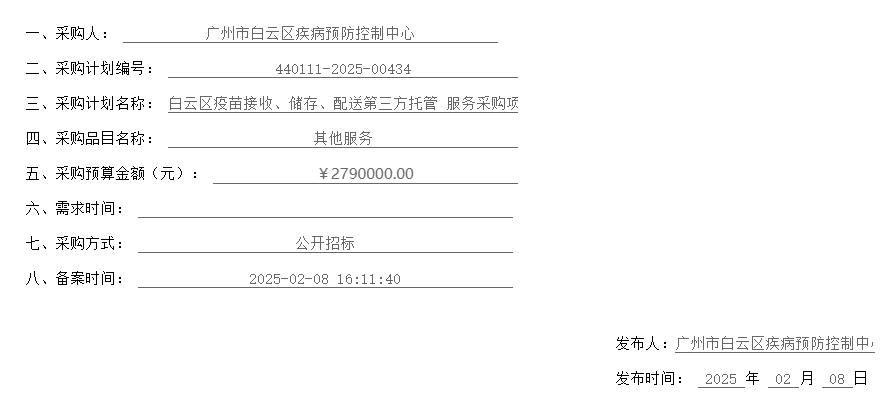 【广州市白云区疾病预防控制中心】广东省广州市白云区疫苗接收、储存、配送第三方托管服务采购项目