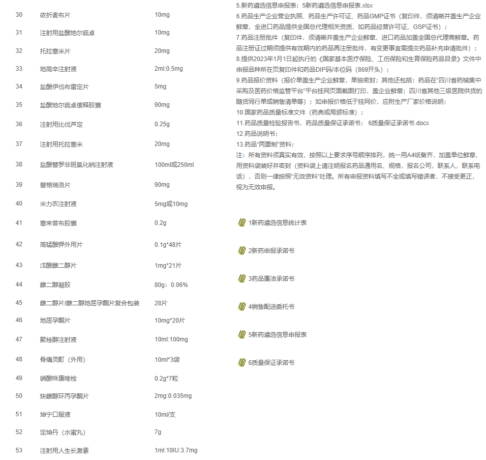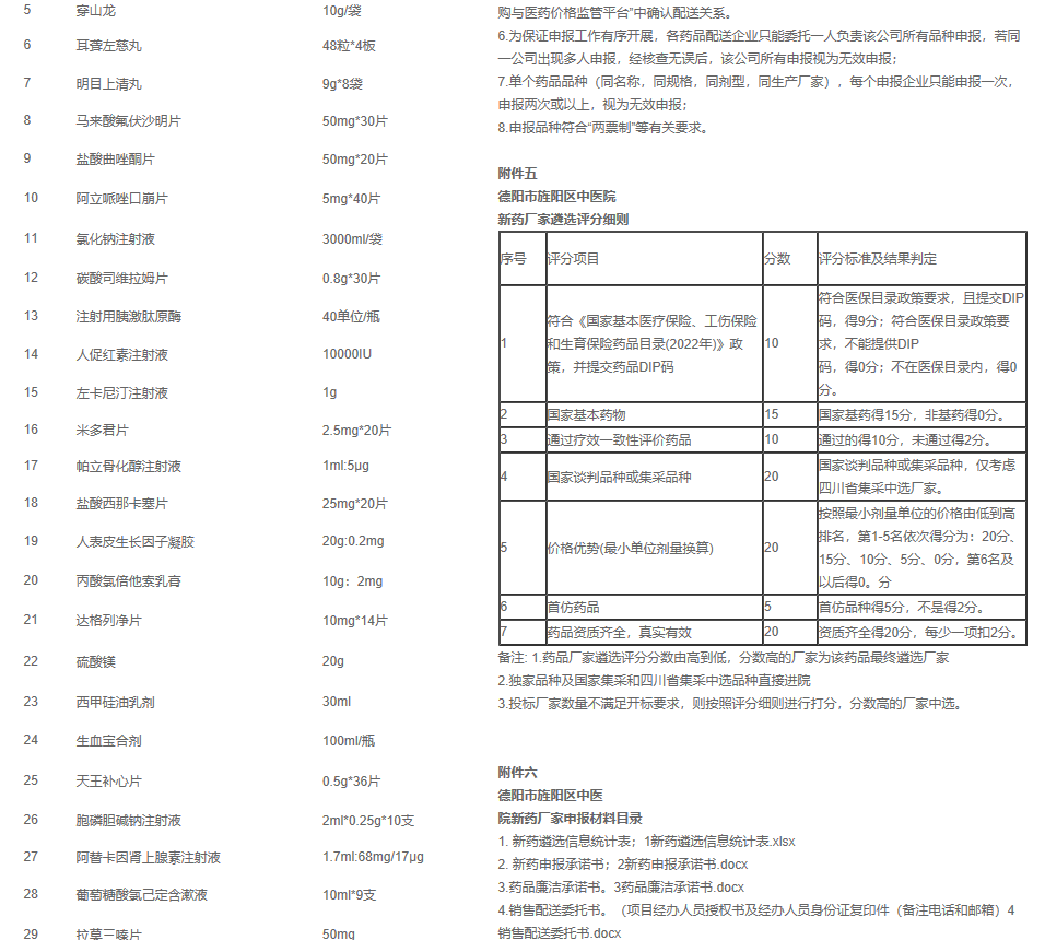 根据医院临床科室诊疗实际需求,医院药事管理与药物治疗学委员会严格按制度与流程, 近日论证通过了以下新药品种进院 (目录见附件一、附件二、附件三),为进一步确定药品厂家, 按照我院制定的药品厂家遴选基本原则(附件四)、评分细则(附件五),医院将组织遴选小组会议进行遴选,讨论通过后完成药品进院。请我院现有药品供应商积极报送上述药品厂家资料(集采药品由集采配送商报送),相关要求见(见附件六)。所有资料须真实有效,按照规定顺序排列,统一用A4纸备齐,加盖单位鲜章,用资料袋密封,否则一律按照“无效资料”处理。纸质申报资料报送时间:2023年6月1日至6月9日,纸质申报资料收集地点:黄河新区院区急诊科楼采购部办公室。