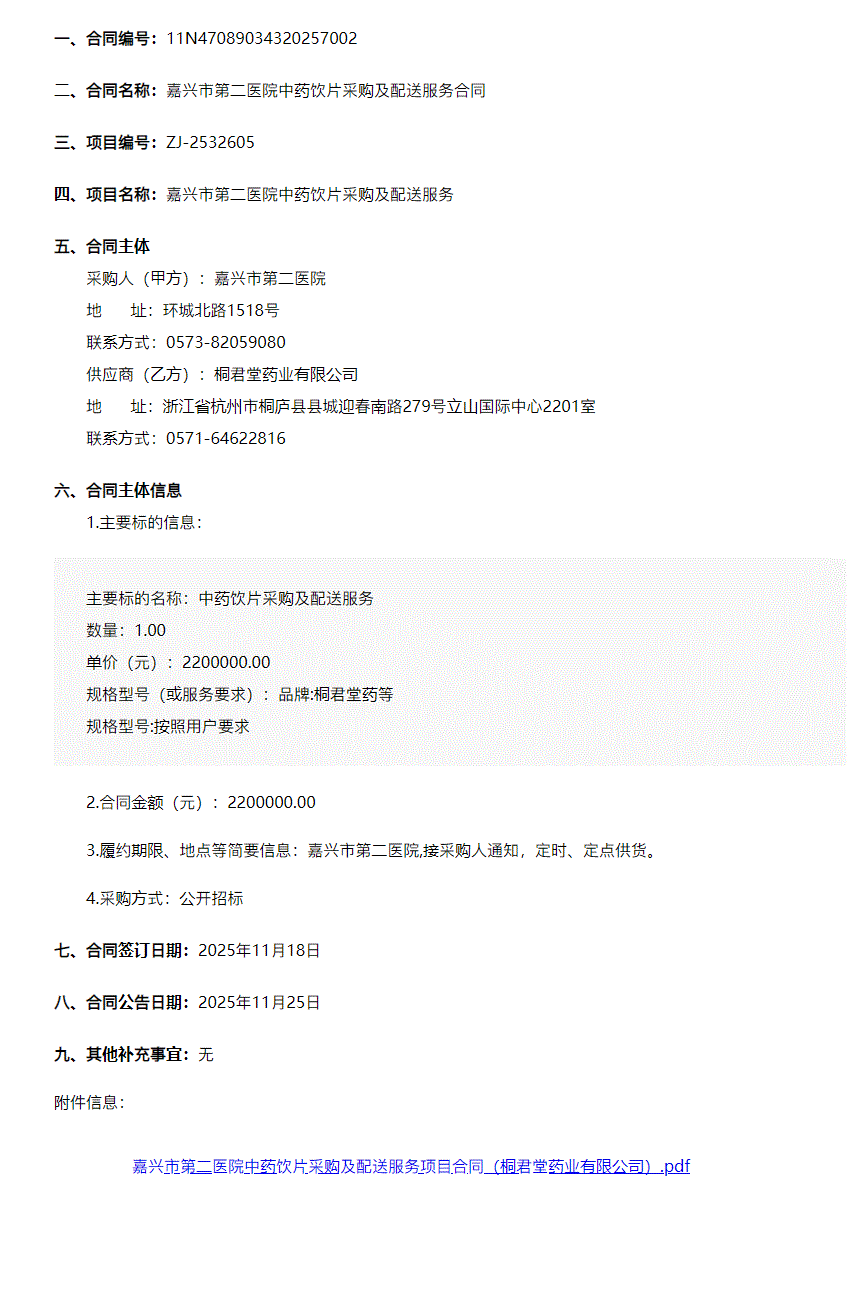 【嘉兴市第二医院】浙江省嘉兴市第二医院中药饮片采购及配送服务合同公告2