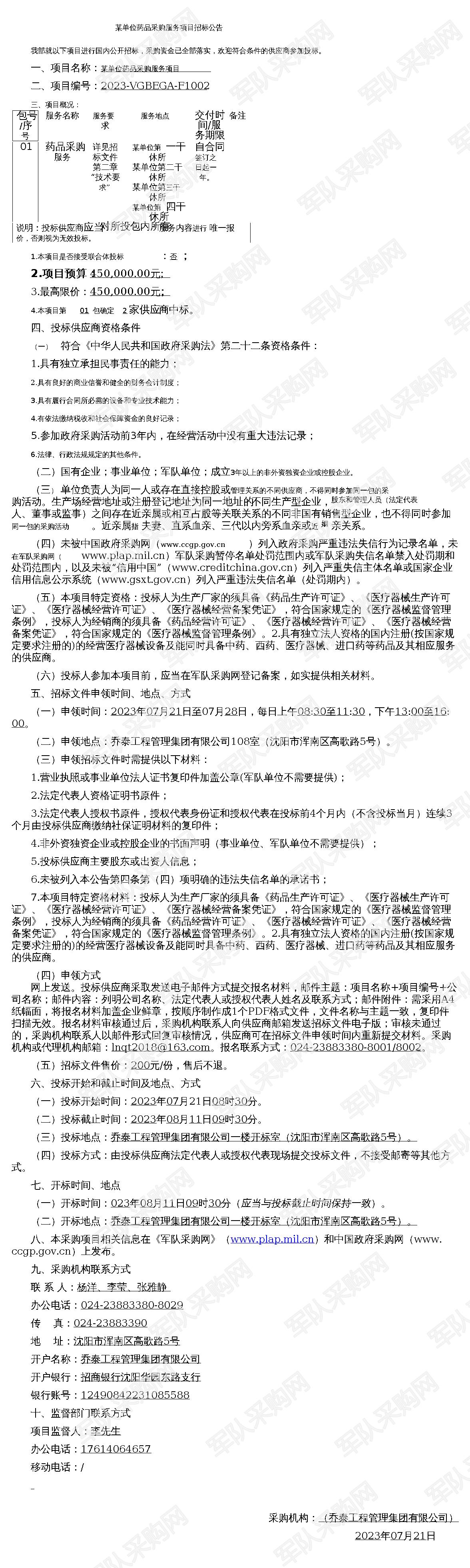 【军队采购】军队采购网某单位药品采购服务项目2023-VGBEGA-F1002
