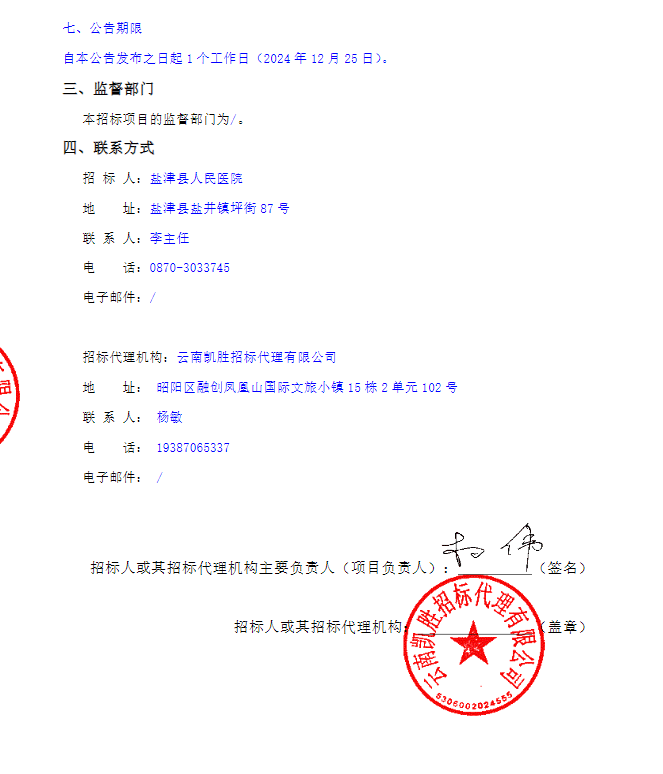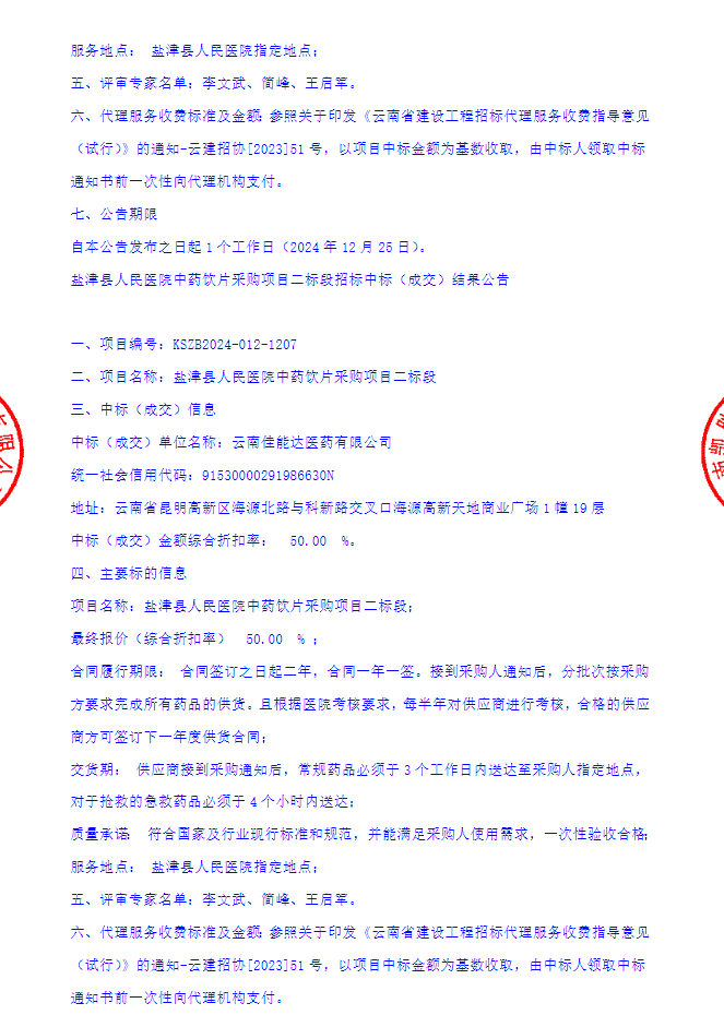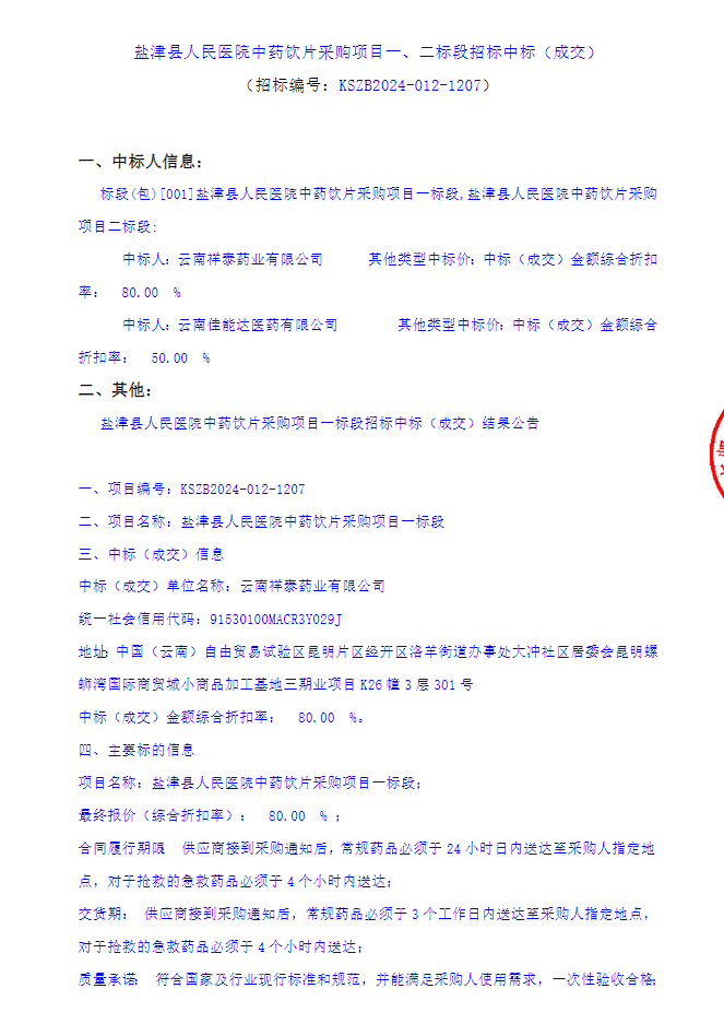【昭通市盐津县人民医院】云南省昭通市盐津县人民医院中药饮片采购项目一、二标段招标中标(成交)