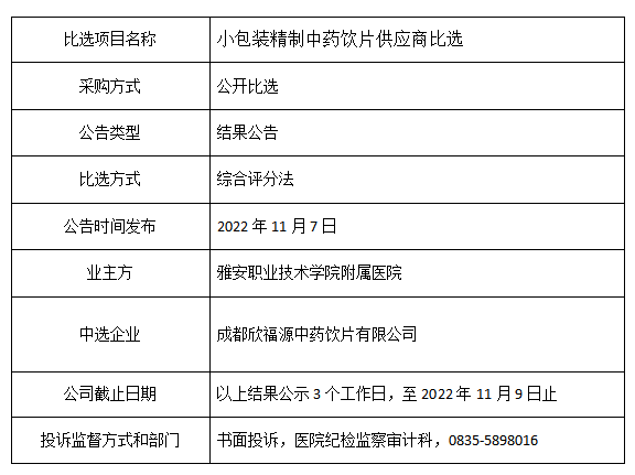 【雅安职业技术学院附属医院】雅安职业技术学院附属医院 关于医院药品供应商的比选结果公示