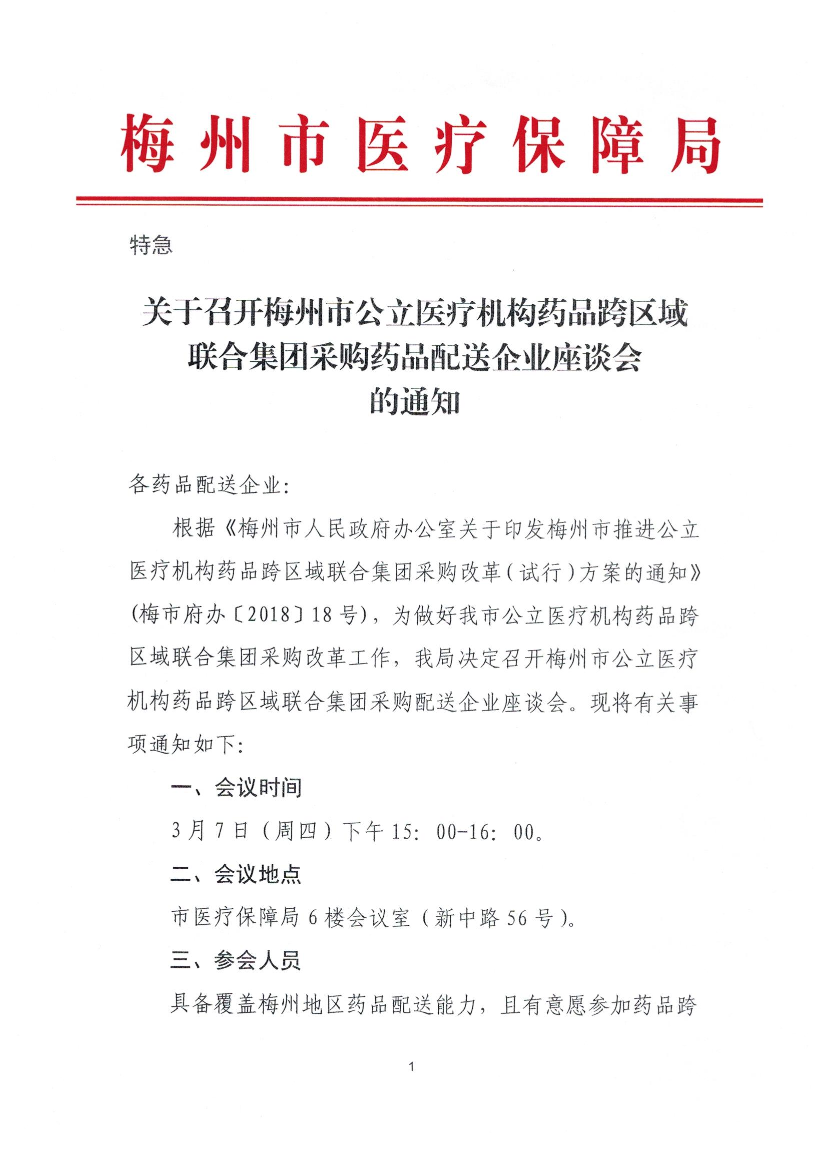 【梅州】全药网转发梅州医保局《关于召开梅州市公立医疗机构药品跨区域联合集团采购药品配送企业座谈会的通知》