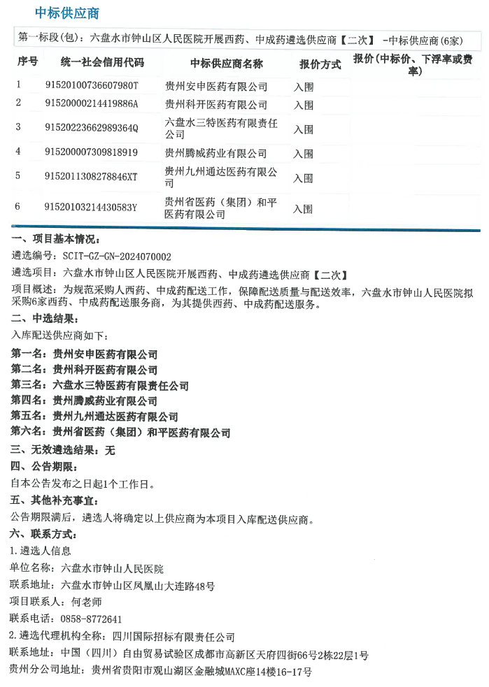 【六盘水市钟山区人民医院】贵州省六盘水市钟山区人民医院开展西药、中成药遴选供应商〔二次〕——中选结果公告