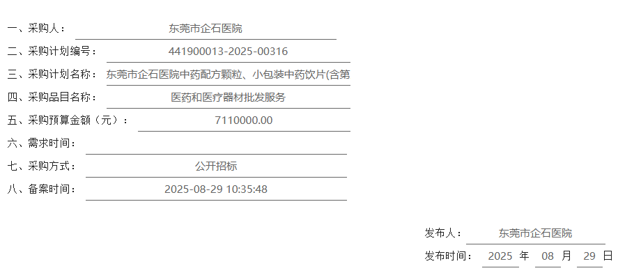 【东莞市企石医院】广东省东莞市企石医院中药配方颗粒、小包装中药饮片(含第三方代调代煎代送)采购项目