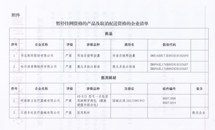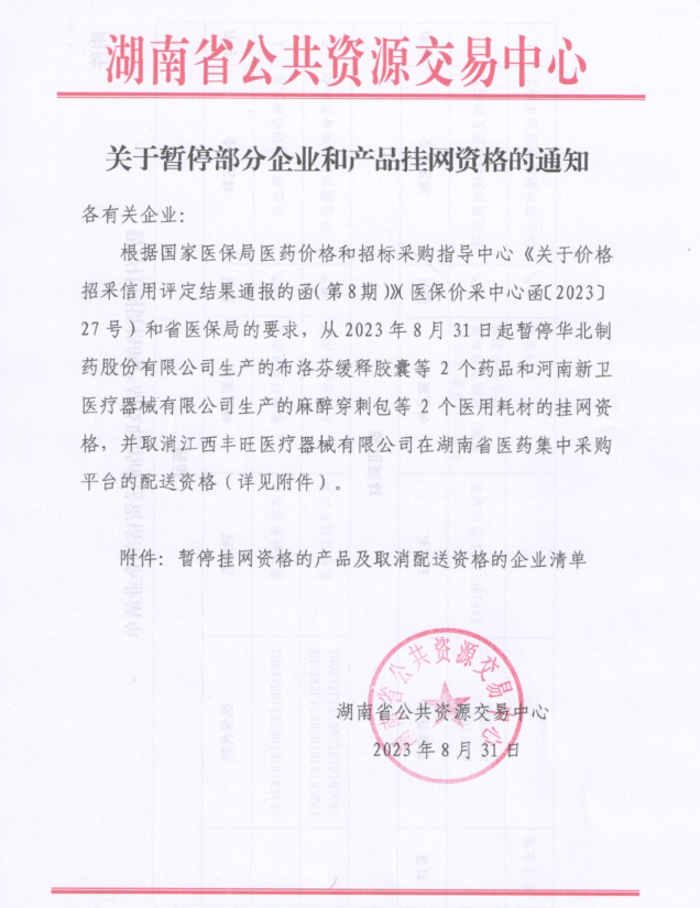 根据国家医保局医药价格和招标采购指导中心《关于价格招采信用评定结果通报的函(第8期)X医保价采中心函〔2023〕27号)和省医保局的要求,从2023年8月31日起暂停华北制药股份有限公司生产的布洛芬缓释胶囊等2个药品和河南新卫医疗器械有限公司生产的麻醉穿刺包等2个医用耗材的挂网资格,并取消江西丰旺医疗器械有限公司在湖南省医药集中采购平台的配送资格(详见附件)。