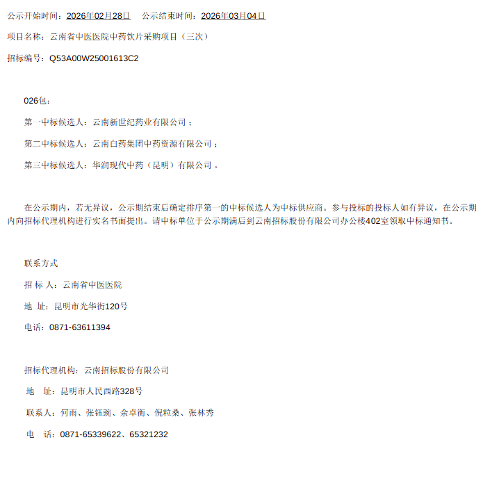 【云南省中医医院】云南省中医医院中药饮片采购项目(三次)中标候选人公示