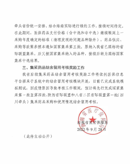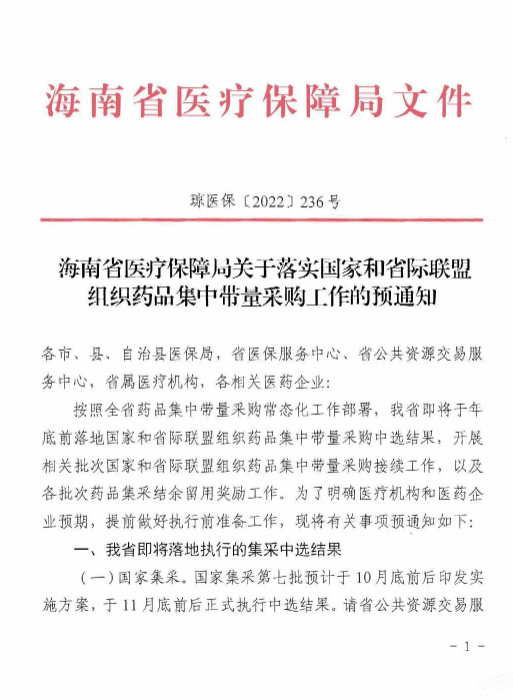 【海南】海南省医疗保障局关于落实国家和省际联盟组织药品集中带量采购工作的预通知