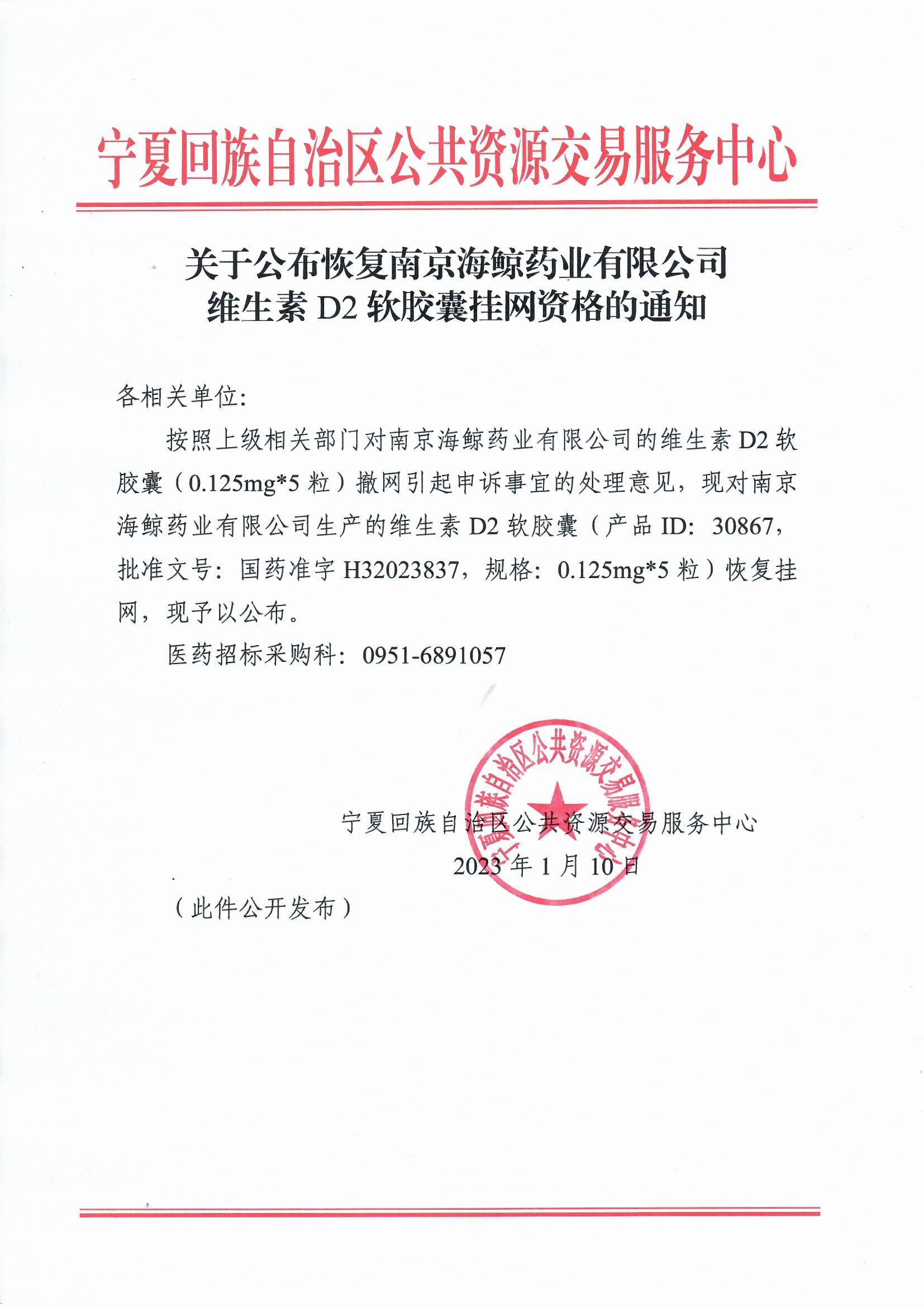 【宁夏】关于公布恢复南京海鲸药业有限公司维生素D2软胶囊挂网资格的通知